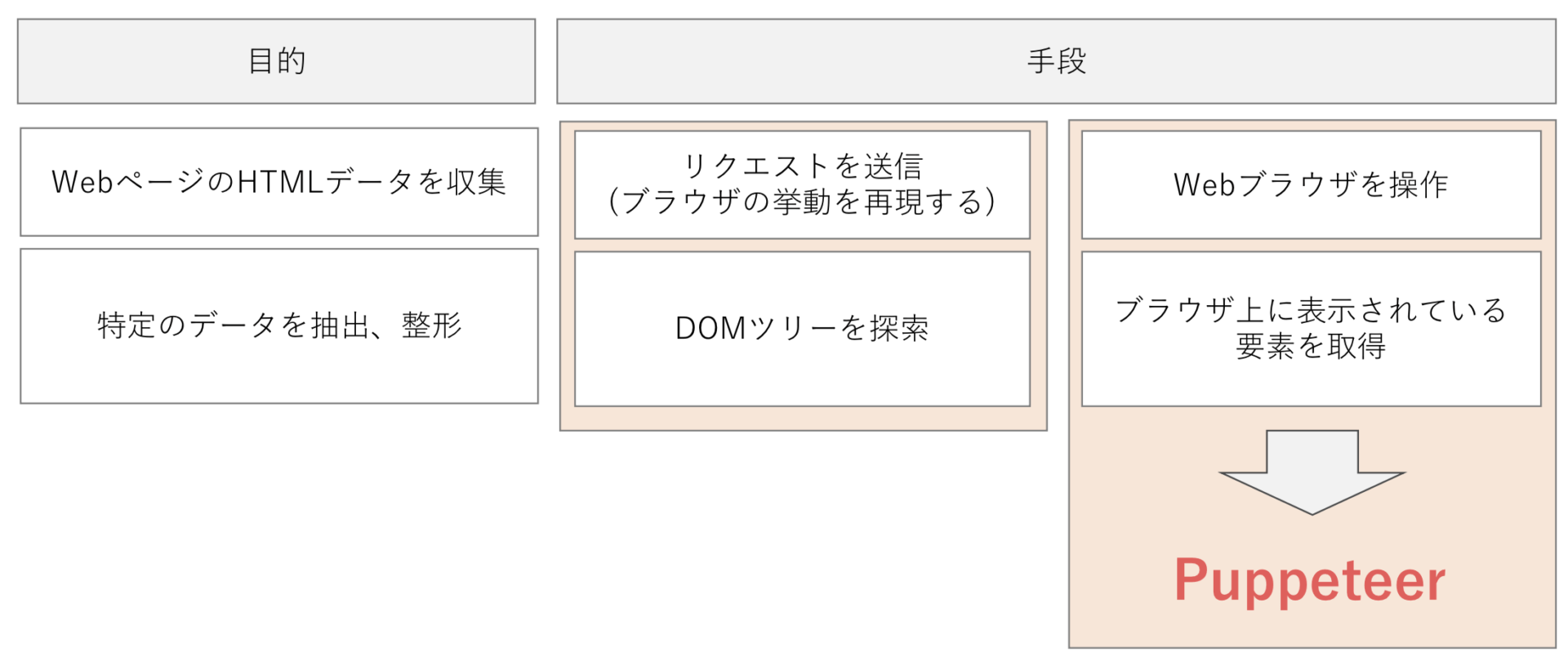 スクレイピングの手法には2つありますが、Puppeteerは後者のブラウザ上に表示されている要素を取得するパターンです。